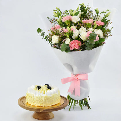 كومبو كيكة وباقة ورد مشكل في غلاف أبيض أنيق