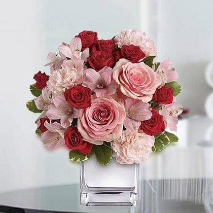 باقة ورود بيضاء ووردية في مزهرية مع كيك ريد فيلفت حجم وسط